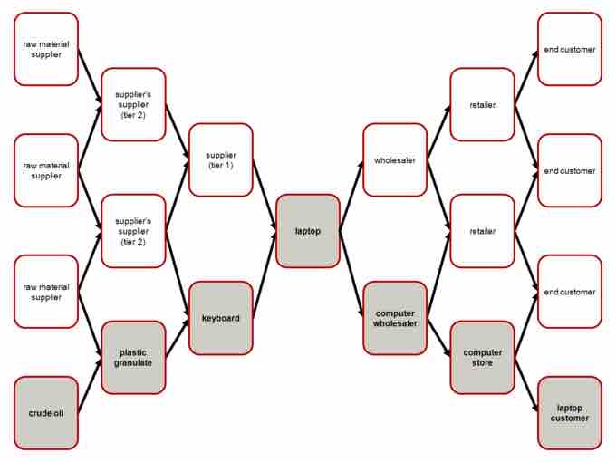 This image shows a simple supply chain, including the various distribution intermediaries a company may work through in order to provide a customer with a product.