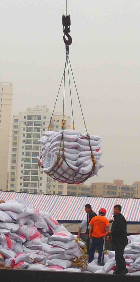 Cargo net being used to unload sacks from a ship at Haikou New Port, Haikou City, Hainan, China.