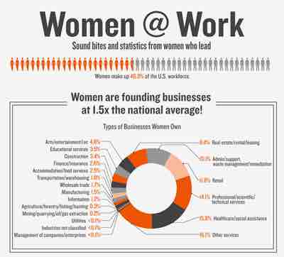Recent years have seen a dramatic rise in the number of businesses owned by female entrepreneurs. As the image shows, women are now founding businesses at a rate 1.5 times the national average; the most prevalent such businesses include healthcare / social assistance (15.8%) and professional / technical services (14.1%).