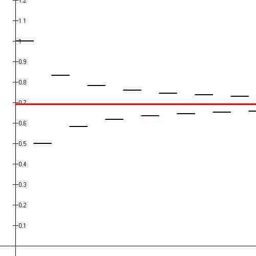 The first fourteen partial sums of the alternating harmonic series (black line segments) shown converging to the natural logarithm of 2 (red line).