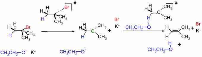 In unimolecular elimination (E1), a leaving group first detaches itself from a carbon atom, leaving behind a carbocation. This is the slow step that is forced by high temperatures and facilitated by polar sovents, and is exactly the same first step as in an SN1 reaction. A base then deprotonates a carbon adjacent to the carbocation, and the electrons from the previous C-H bond then go to form a C=C bond at the carbocation. The mechanism can be illustrated as: