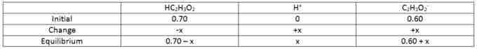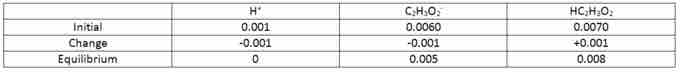 Next, calculate the pH change for a buffer with [HC2H3O2] = 7 mM (7 x 10-3 molar) and [C2H3O2-] = 6 mM (6 x 10-3 molar). The Ka for acetic acid is 1.8 x 10-5.