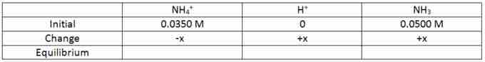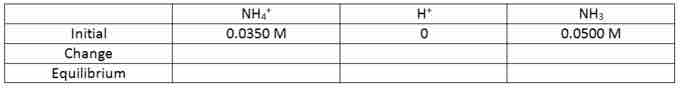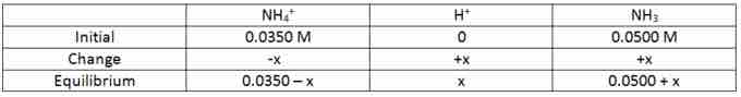 We know that initially there is 0.0350 M NH4+ and 0.0500 M NH3. Before the reaction occurs, no H+ is present so it starts at 0.