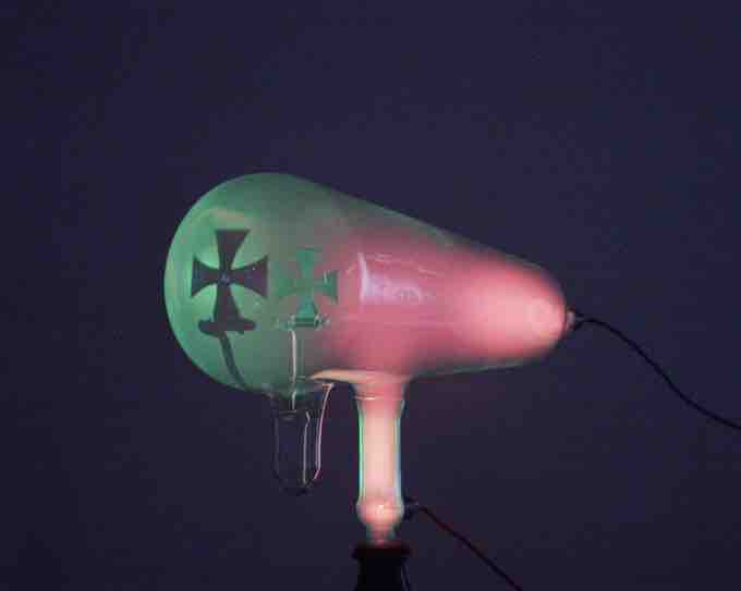 Cathode rays are invisible, but their presence was first detected in early vacuum tubes when they struck the glass wall of the tube, exciting the atoms of the glass and causing them to emit light—a glow called fluorescence. Researchers noticed that objects placed in the tube in front of the cathode could cast a shadow on the glowing wall, and realized that something must be traveling in straight lines from the cathode. After the electrons reach the anode, they travel through the anode wire to the power supply and back to the cathode, so cathode rays carry electric current through the tube.