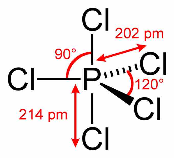 In the PCl5 molecule, the central phosphorus atom is bonded to five Cl atoms, thus having 10 bonding electrons and violating the octet rule. The overall geometry of the molecule is depicted (trigonal bipyramidal), and bond angles and lengths are highlighted.