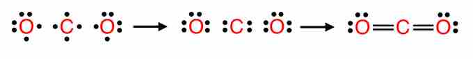 This diagram shows the conceptual stages of drawing the Lewis structure for a molecule of carbon dioxide (CO2).