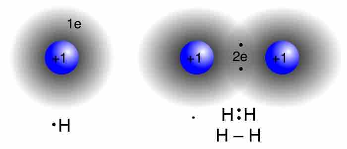 Since each hydrogen atom has one electron, they are able to fill their outermost shells by sharing a pair of electrons through a covalent bond.
