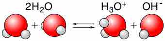 A water molecule protonates a neighboring water molecule, yielding hydronium and hydroxide ions.
