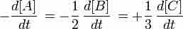 This expression relates the rates of disappearance and appearance of chemical species in the reaction A + 2B --> 3C.