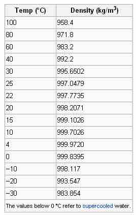 Look carefully at the relationship between water's temperature and its density. Beginning at 100 °C, the density of water steadily increases, as far as 4 °C. At that point, the density trend reverses. At 0 °C, water freezes to ice and floats.