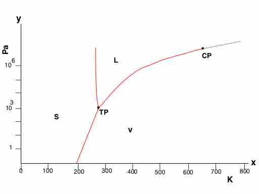 The three phases of water – liquid, solid, and vapor – are shown in temperature-pressure space.