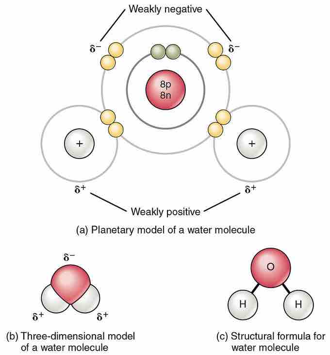Owing to the electronegativity difference between hydrogen (H) and oxygen (O) atoms, and the bent shape of the H2O molecule, a net dipole moment exists. The figure indicates the partial charges that the atoms possess.