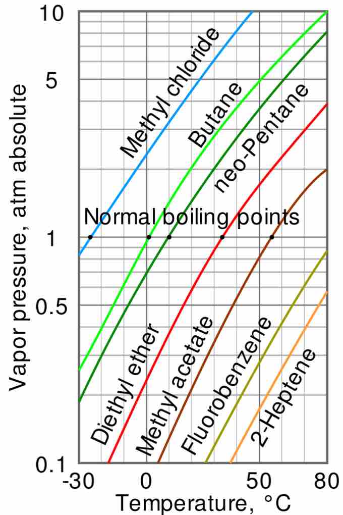 The variation of vapor pressure with temperature is not linear. The intercepts of each curve with the horizontal line at 1 atm (i.e. 760 torr) indicate the normal boiling point of each liquid, ranging from -25 °C for methyl chloride to over 80 °C for fluorobenzene and 2-heptene.