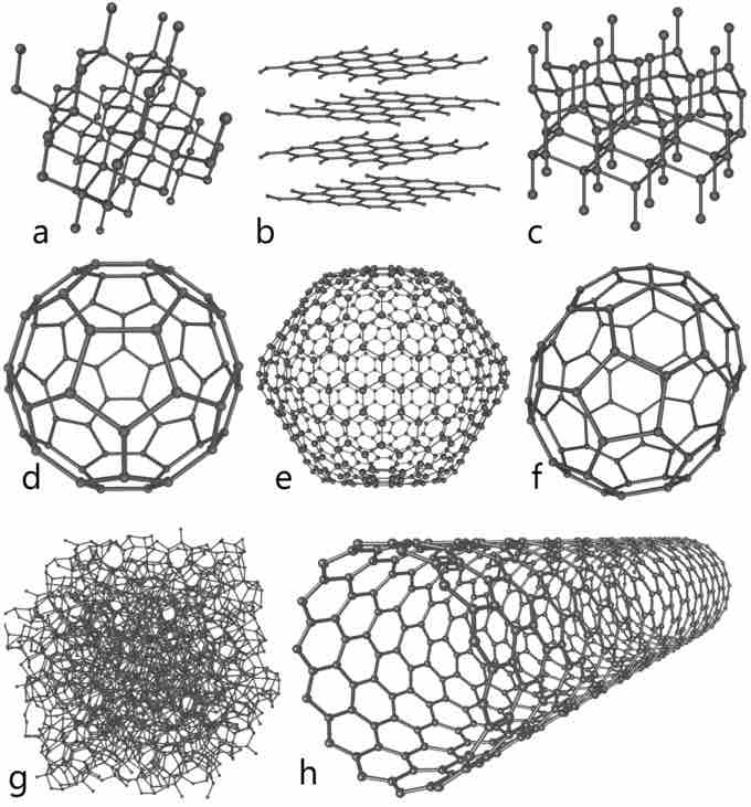Allotropes of carbon: a) Diamond, b) Graphite, c) Lonsdaleite, d) C60 (Buckminsterfullerene or buckyball), e) C540, f) C70, g) Amorphous carbon, and h) single-walled carbon nanotube, or buckytube.