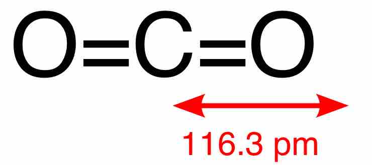 A central carbon atom is connected to two oxygen atoms via double bonds in a linear structure. The molecule has no net dipole moment because it's centrosymmetric.