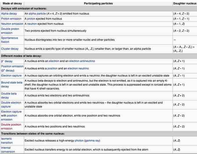 Radionuclides can undergo a number of different reactions, summarized here. A nucleus with mass number A and atomic number Z is represented as (A, Z). The column "Daughter nucleus" indicates the difference between the new nucleus and the original nucleus. Thus, (A − 1, Z) means that the mass number is one less than before, but the atomic number didn't change.