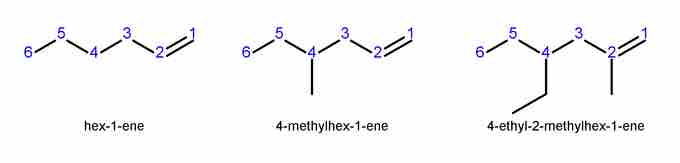 Examples of substituted hex-1-enes. Remember that the 1 could go in front of the word hexene as well. For example, the middle molecule could be named as 4-methyl-1-hexene.