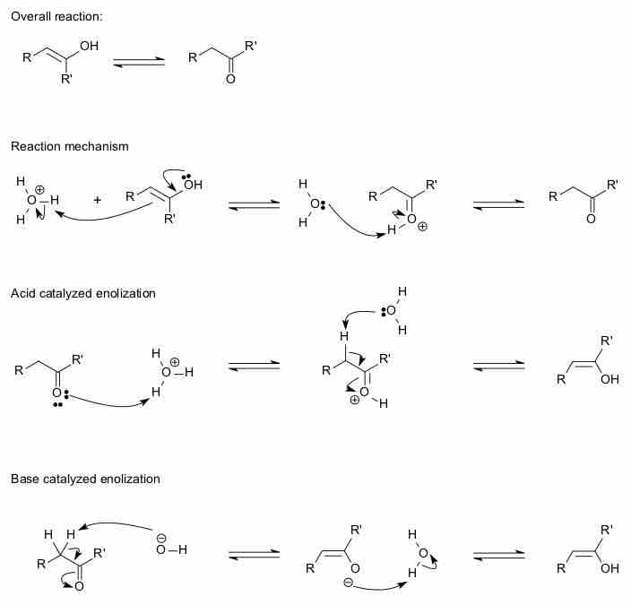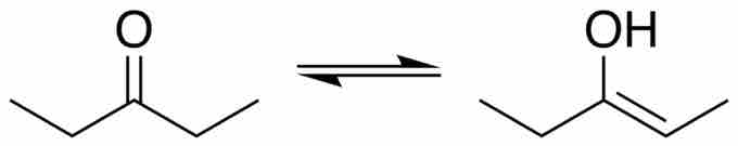 Both aldehydes and ketones exist in an equilibrium with their enol forms; the enol form is defined as an alkene with a hydroxyl group affixed to one of the carbon atoms composing the double bond. The keto form predominates at equilibrium for most ketones. However, the enol form is important for some reactions because the deprotonated enolate form is a strong nucleophile. The equilibrium is strongly thermodynamically driven, and at room temperature the keto form is favored. The interconversion can be catalyzed by the presence of either an acid or a base.