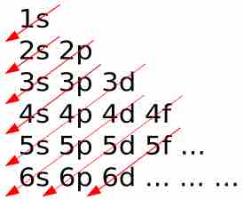 Order in which orbitals are arranged by increasing energy according to the Madelung rule. Each diagonal red arrow corresponds to a different value of n + l.