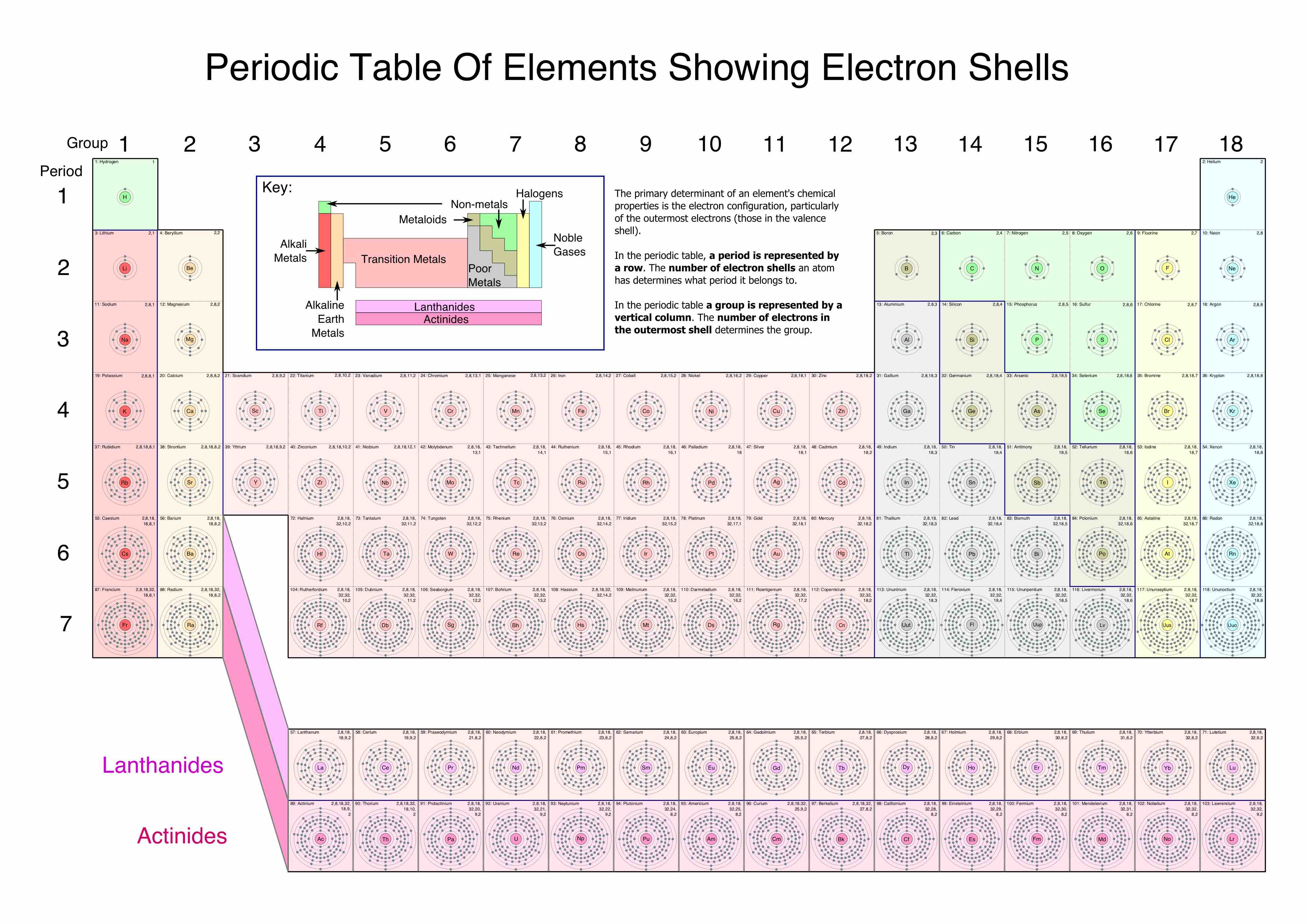 Position in the periodic table based on electron shell configuration. This image shows the entire periodic table, with diagrammatic atoms and electron shells filling with movement through the table. This image breaks out the electron configuration numerically, showing the population of electrons in each subshell, starting each period with a completely filled noble gas.