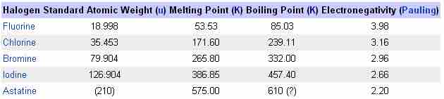 The halogens are nonmetallic elements in Group 17 of the periodic table. They include fluorine, chlorine, bromine, iodine, and astatine. Ununseptium, which is not a naturally occurring element, is also often considered a halogen. As typical nonmetals, they have low melting and boiling points. A unique characteristic of halogens is that they are the only element group that includes elements that belong to all three classical states of matter: solid, liquid, and gas at room temperature.