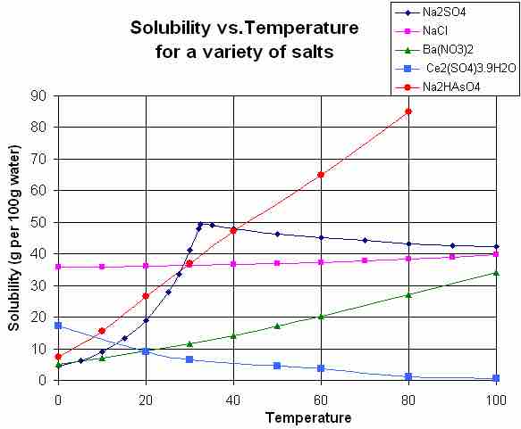 This chart shows the solubility of various substances in water at a variety of temperatures (in degrees Celsius). Notice how NaCl's solubility is relatively constant regardless of temperature, whereas Na2SO4's solubility increases exponentially over 0–35 degrees Celsius and then abruptly begins to decrease.