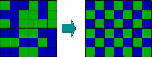 This image shows a series of blue and green squares going from a state of disorder (randomness) to a state of order (a clear repeating pattern). In this example, that is to say, entropy decreases and opposes the transition.