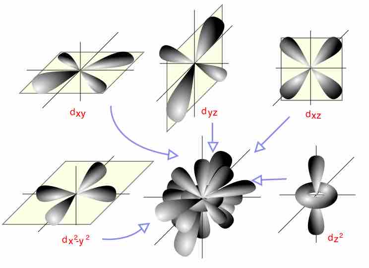 This gives an overview of the d orbitals. The central model shows the combined d-orbitals on one set of axes.