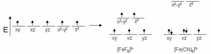As an example, Fe prefers to exist as Fe3+ and is known to have a coordination number of six. Since the configuration of Fe3+ has five d electrons, we would expect to see five unpaired spins in complexes with Fe. This is true for [FeF6]3-; however, [Fe(CN)6]3- only has one unpaired electron, making it a weaker magnet. This trend can be explained based on the properties of the ligands. We expect CN− to have a stronger electric field than that of F−, so the energy differences in the d orbitals should be greater for the cyanide complex.