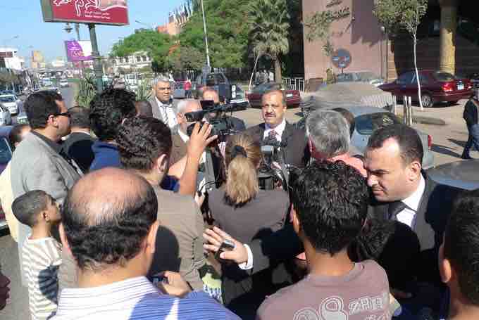 Mohamed el-Beltagy, running for the lower house of Parliament, stops to give an impromptu speech in the median dividing the main road of his neighborhood in Cairo.