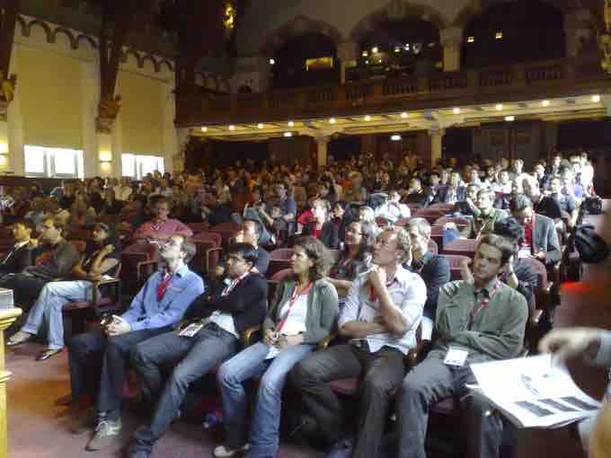 An audience listens to a speech at a conference