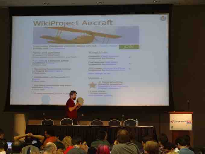Erik Möller speaking about a visual redesign of WikiProject main pages in his presentation on 'The purpose-driven social network: Supporting WikiProjects with technology' at Wikimania 2012.