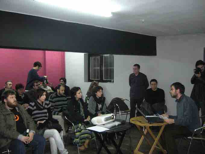 The speaker is directly addressing the audience at the left side with the PowerPoint slides in the background.