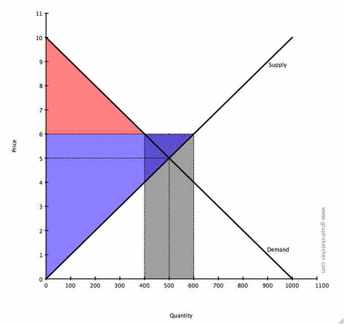 is simply a supply and demand curve that demonstrates the consumer surplus and producer surplus opportunities in basic supply and demand chart. In this scenario, without external governmental intervention, the price equilibrium will remain in the center of the graph. However, the government may implement price supports that artificially consume some of the consumer surplus (in , this is 200 units). This drives the price upwards to $6 per unit despite the fact that the consumer is not gaining additional quantity (it is artificial quantity, as purchased by the government).