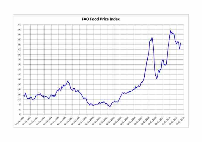 Other concerns revolve around dramatic soil damage due to short-term yield increasing strategies, growing immunity to pesticides, loss of rural space for farming (due to urbanization), and availability of clean water for irrigation. All of these factors may reduce the aggregate supply and thus drive up prices. demonstrates rising food prices, perhaps from a number of the supply reduction factors discussed in this atom (or potentially unidentified factors). Controlling supply is a critical component of ensuring everyone has access to affordable food, and maintaining our ecosystem will clearly play a critical role in the years ahead.
