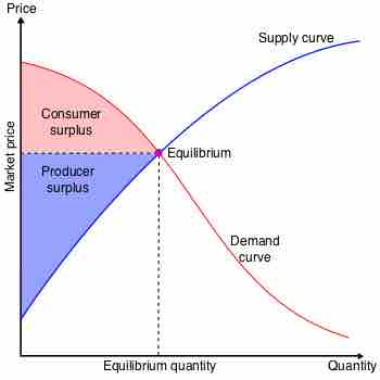 Producer surplus is the shaded area directly above the supply curve, up to the equilibrium point. Consumer surplus is the shaded area directly under the demand curve, up to the equilibrium point.