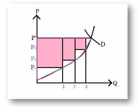 This process is repeated for every price level up to the equilibrium price. To find the resulting total producer surplus, all of the rectangles for the individual price levels are added together, and the total area is the total producer surplus. Below, the total producer surplus is made of all three pink rectangles - the surpluses at price levels of