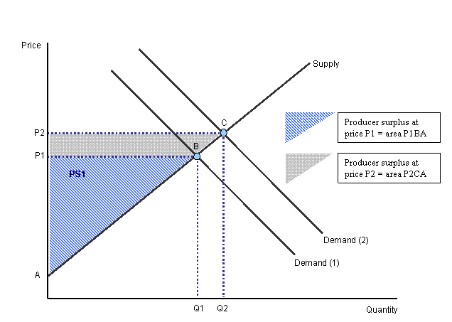 At an initial demand represented by the "Demand (1)" curve, producer surplus is the blue triangle made of