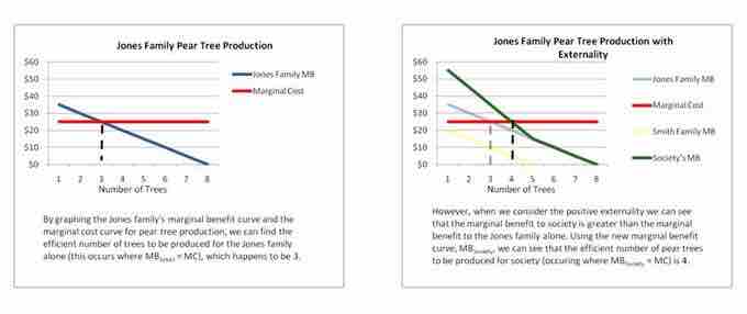 Take another example. The Jones family plants pear trees on their property which is adjacent to the Smith family. The Smith family gets an external benefit from the Jones family's pear trees because they pick up the pears that fall on the ground on their side of the property line (see ). This is an externality because the Smith family does not pay the Jones family for the utility received from gathering fallen pears. As a result, the Jones family plants too few pear trees. In response, the Jones family can put up a net that will prevent pears from falling on the Smith's side of the property line, eliminating the externality. Alternatively, the Jones could impose a cost on the Smith family if they want to continue to enjoy the pears from the pear trees. Both parties will be better off if they can agree to the second scenario, as the Smith family will continue to enjoy pears and the Jones family can increase the production of pears.