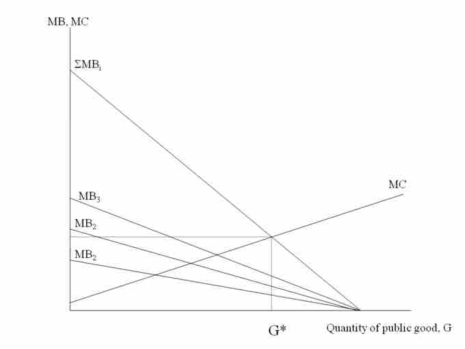 The sum of the individual marginal benefit curves (MB) represent the aggregate willingness to pay or aggregate demand (∑MB). The intersection of the aggregate demand and the marginal cost curve (MC) determines the amount of the good provided.