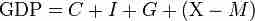 GDP = C + I + G + ( X - M ); where C = household consumption expenditures / personal consumption expenditures, I = gross private domestic investment, G = government consumption and gross investment expenditures, X = gross exports of goods and services, and M = gross imports of goods and services.