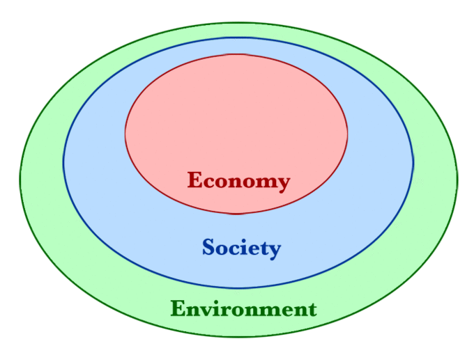 This diagram illustrates that society and the economy are subsets of the environment. It is not possible for social and economic systems to exist independently from the environment. Natural resource economics focuses on the demand, supply, and allocation of natural resources to increase sustainability.