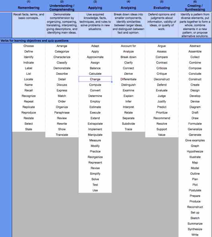 That said, we also realize that the taxonomy is not ironclad. It is not a rigid scientific system of classification; in addition, not all possible learning objectives beginning with the verb "calculate" necessarily require the same level of conceptual thinking! We take care to write learning objectives that begin with a verb that reflects the depth of the content it is associated with.