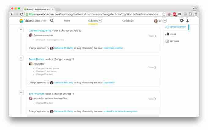 One of the many things that makes Boundless unique is that we leverage the wider community to continuously improve our content and keep it up to date. Users can submit feedback and propose changes to our content at any time. All proposed changes are reviewed daily by the Boundless Content Team, and those that constructively improve our content are published. All changes to our content are tracked; you can see the change over time for a given concept through the "Version History" tab in the right sidebar.