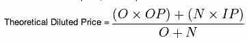 In this equaltion O = original number of shares, OP = Current share price, N = number of new shares to be issued, and IP = issue price of new shares. The dilution of the shares outstanding should theoretically be met with a corresponding drop in share price.