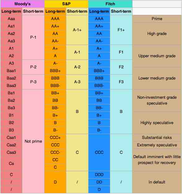 Moody's assigns bond credit ratings of Aaa, Aa, A, Baa, Ba, B, Caa, Ca, C, with WR and NR as withdrawn and not rated. Standard & Poor's and Fitch assign bond credit ratings of AAA, AA, A, BBB, BB, B, CCC, CC, C, and D.