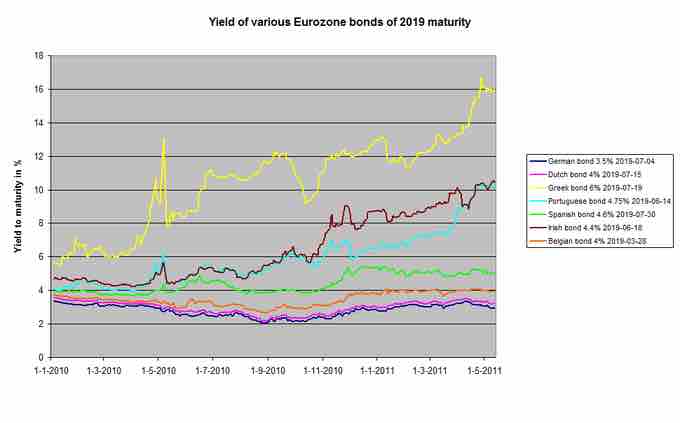 Development of yield to maturity of bonds of 2019 maturity of a number of Eurozone governments.