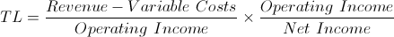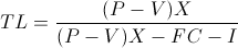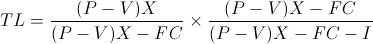 TL = Total Leverage. P = Unit Revenue. V = Unit Variable Cost. X = Units Sold. FC = Fixed Costs. I = Interest Expense.