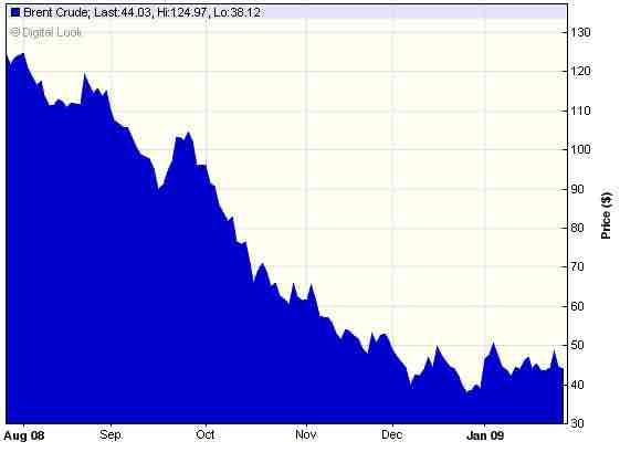 This graph shows the price of crude oil between August 2008 and January 2009. Companies depending on the price of oil for their supply can implement hedging strategies using derivatives to manage this exposure.