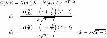 Where: N is the cumulative distribution function of the standard normal distribution; T - t is the time to maturity; S is the spot price of the underlying asset; K is the strike price; r is the risk free rate; and omega is the volatility of returns of the underlying asset.